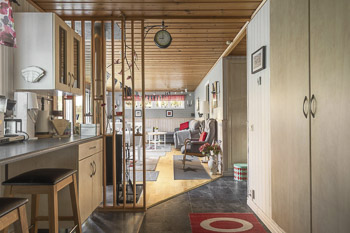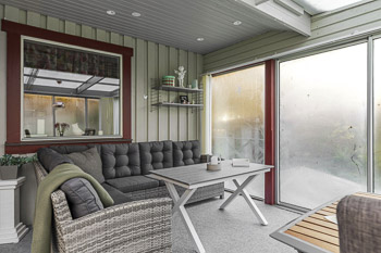 großes geräumiges Wohnzimmer mit Ausgang in die verglaste Veranda, Kaminofen zwischen Küche und Wohnzimmer