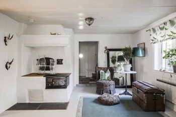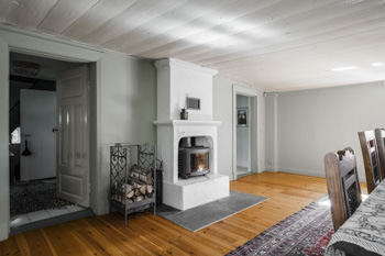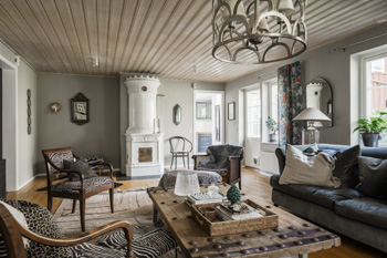 großes Wohnzimmer mit altem restaurierten Kachelofen
