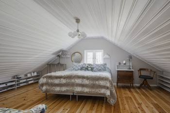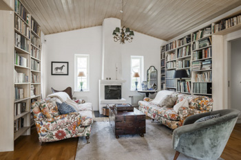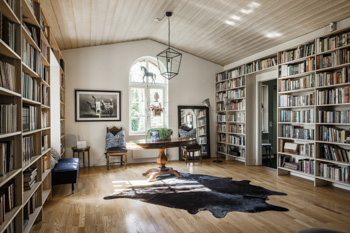 große Bibliothek, hoher Raum bis zum Dachfirst, Kaminofen