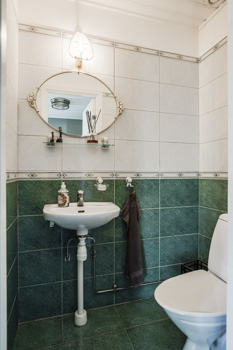 Badezimmer mit WC, Waschbecken, Badewanne und Dusche