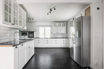 große gepflegte Landküche mit Einbauküche, E-Herd mit Dunstabzug, eingebaute Mikrowelle, Kühlschrank, Gefrierschrank, Geschirrspüler und Platz für eine große Essecke