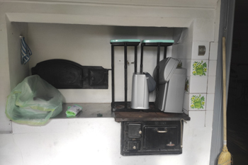 Küche mit Holzherd und Brotbackfach, Gaskühlschrank, Gasherd und Ausgang in den Garten