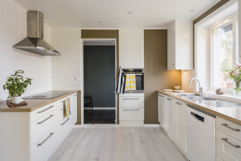große Küche mit Einbauküche, Kochfeld mit Dunstabzug, eingebauter Backofen, Kühlschrank, Gefrierschrank, Geschirrspüler