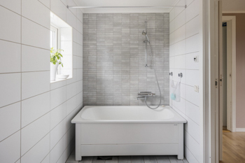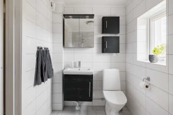 gefliestes Badezimmer mit Dusche, WC und Waschbecken